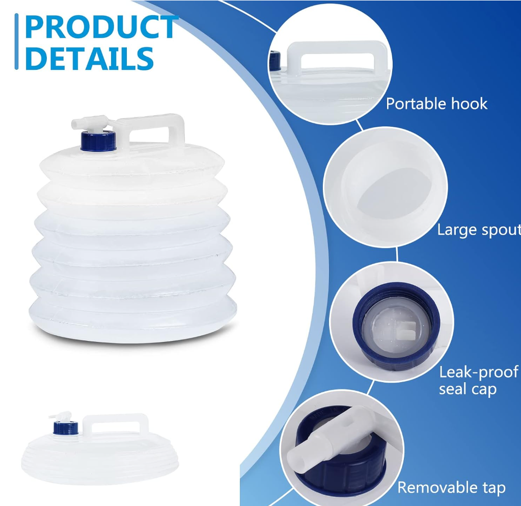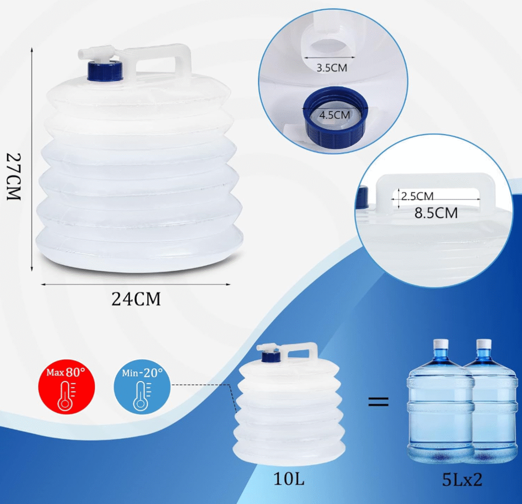 Bu 10 litrlik qatlanan su konteyneri ekoloji cəhətdən təmiz, BPA-sız, toksik olmayan PE materialdan hazırlanmışdır və uzunmüddətli istifadə üçün təhlükəsizdir.